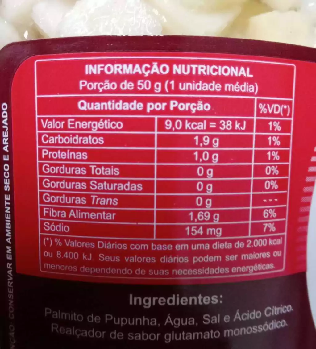 INGREDIENTES: PALMITO DE PUPUNHA, ÁGUA, SAL E ÁCIDO CÍTRICO.